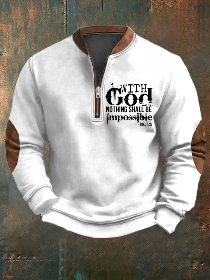 Men's Vintage Faith "With God Nothing Shall Be Impossible Luke 1:37" Printed Zip Collar Sweatshirt