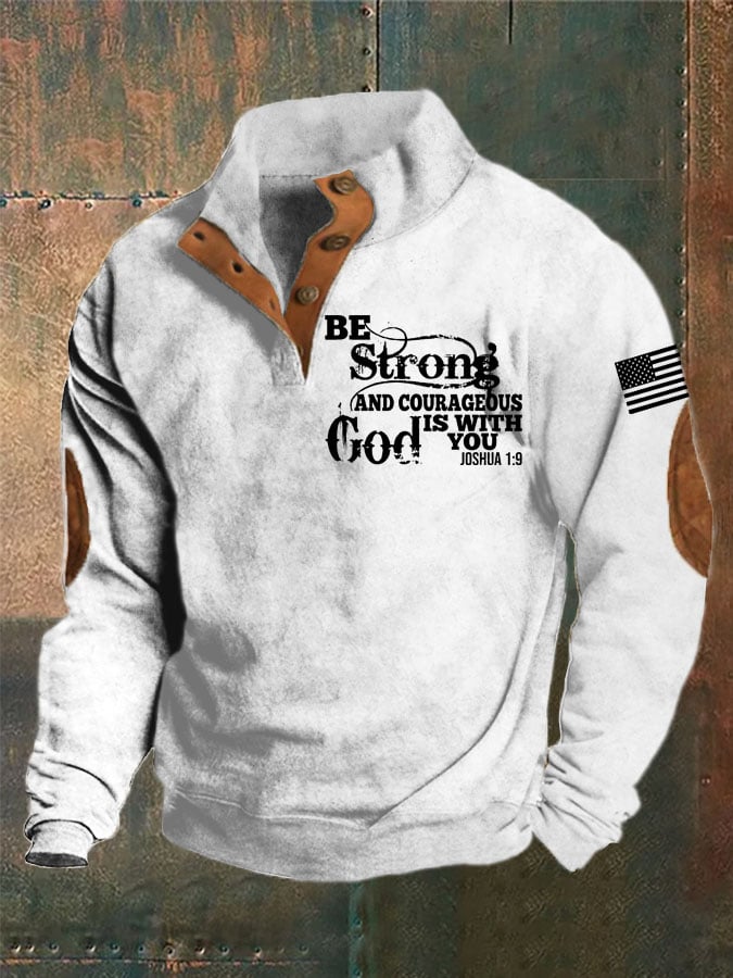 Men's Vintage Faith "Be Strong And Courageous God Is With You Joshua 1:9" Printed Stand Collar Button Down Sweatshirt