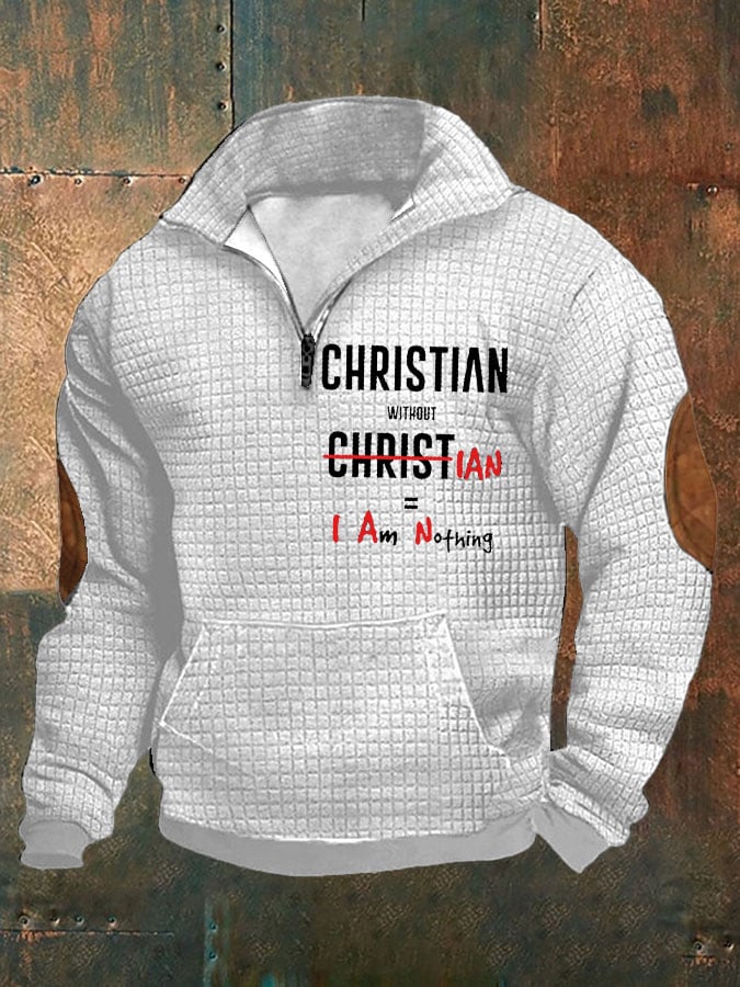 Men's Retro Faith "Without Christ I Am Nothing" Printed Stand Collar Checkered Fabric Sweatshirt