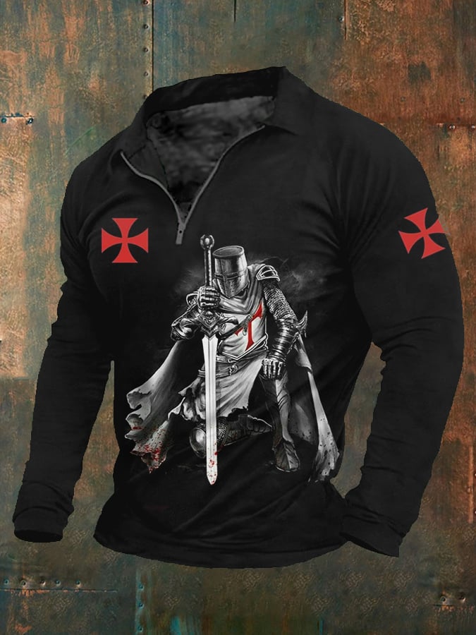 Men's Retro Templar Knight Print Casual Zipper Neck Sweatshirt
