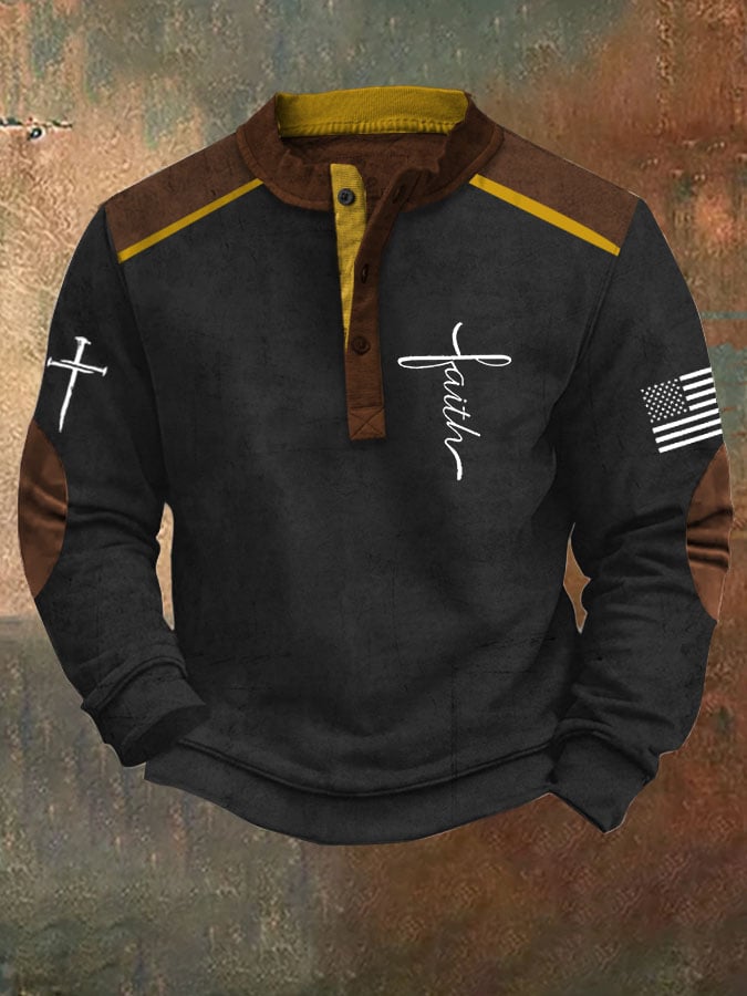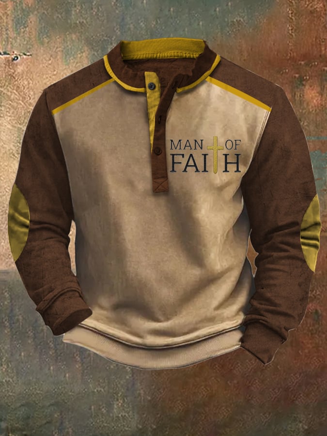 Men's Retro Contrast Faith Print Three Button Henley Sweatshirt