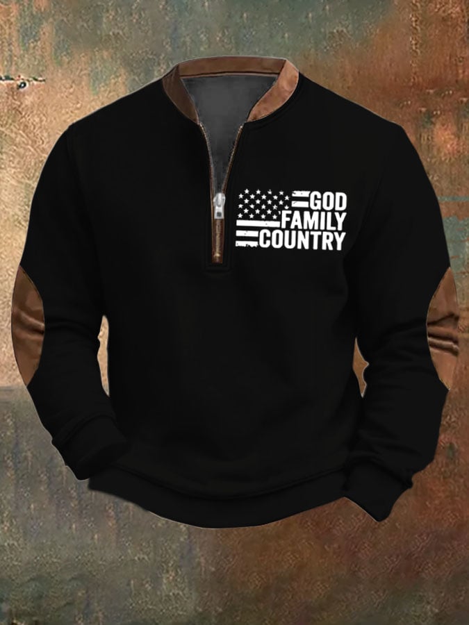 Men's Retro Faith "God Family Country" Printed Zipper Collar Sweatshirt