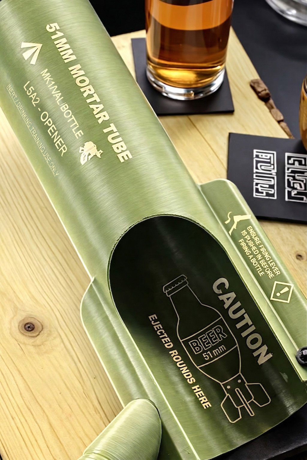 The 51mm Beer Bottle Mortar is a solid novelty bottle opener designed so you drop the bottle into the tube like a real mortar round. As the bottle seats, the cap is removed and launched clear, delivering a hugely satisfying and unforgettable way to open your beer.