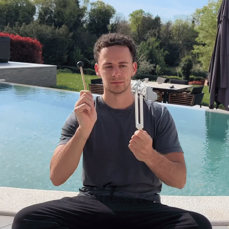 Tap the fork lightly with the mallet, then rest the base on your skin. Feel the gentle vibration travel through the tissue, releasing tension and helping your body relax.
