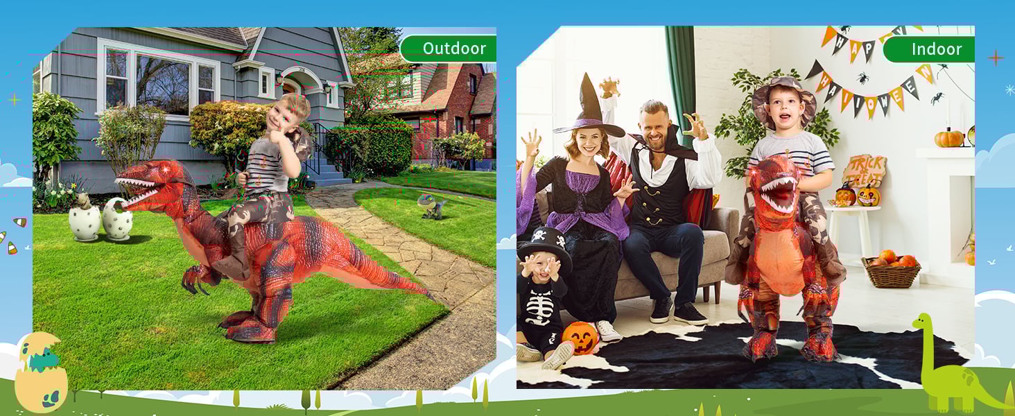 The dinosaur costumes for Halloween are made of high-strength waterproof polyester which is against rips and tears, the excellent stitching improves the durability of the inflatable costumes. Moreover, our trex dinosaur costumes are provided with a powerful-duty blower to continuously airflow inflate the costumes.