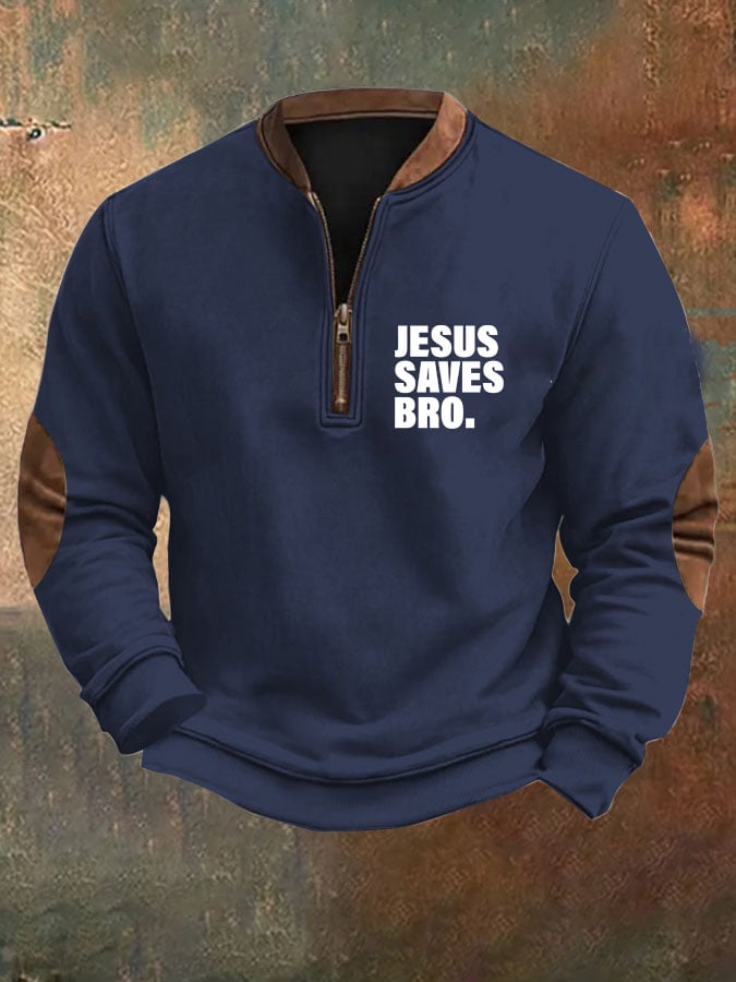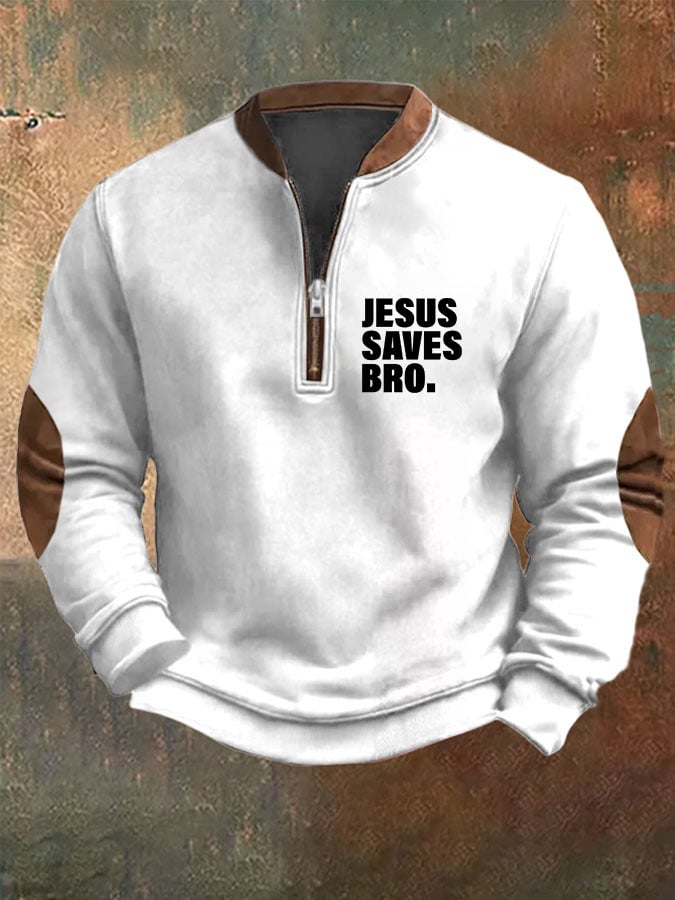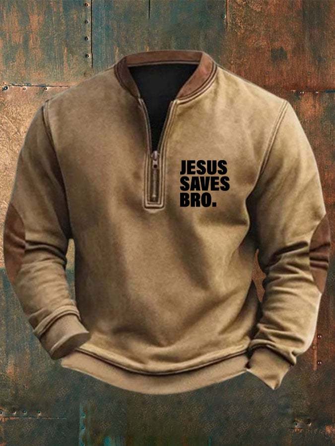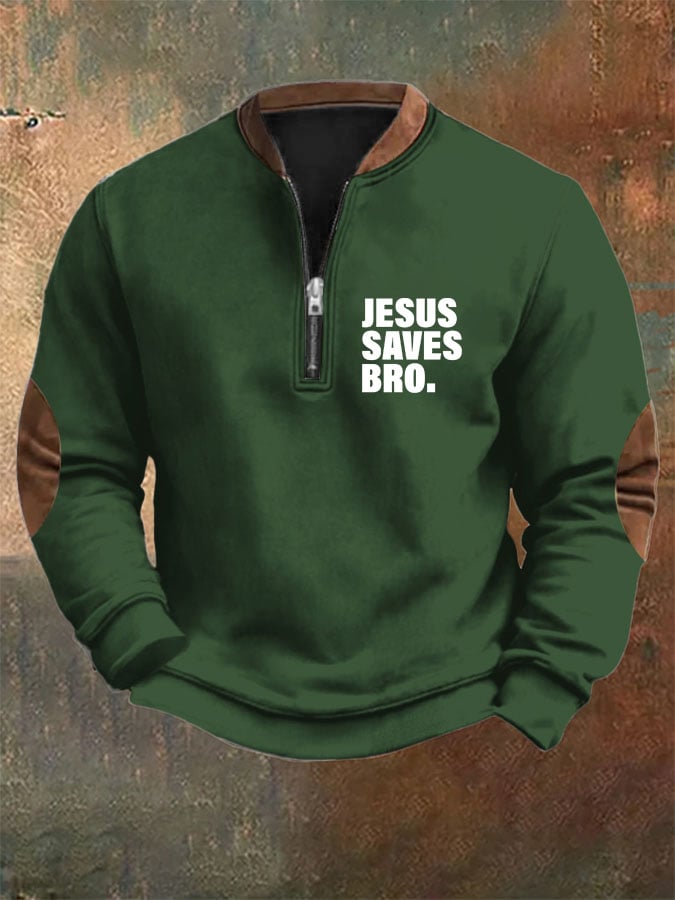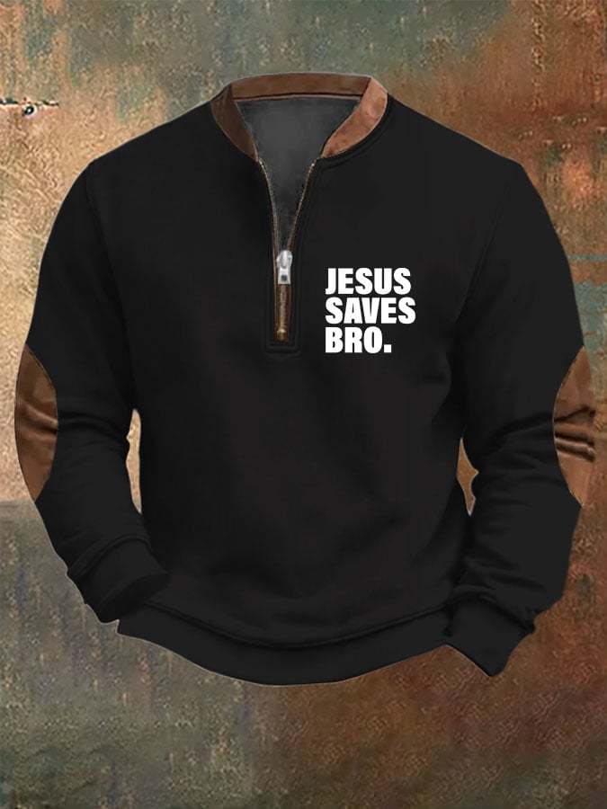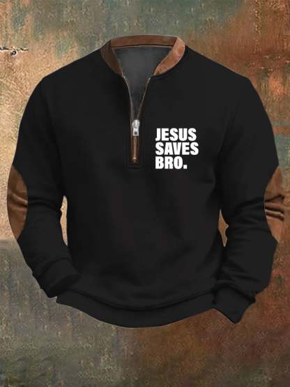 Men's Jesus Saves Bro Printed Zip Collar Sweatshirt