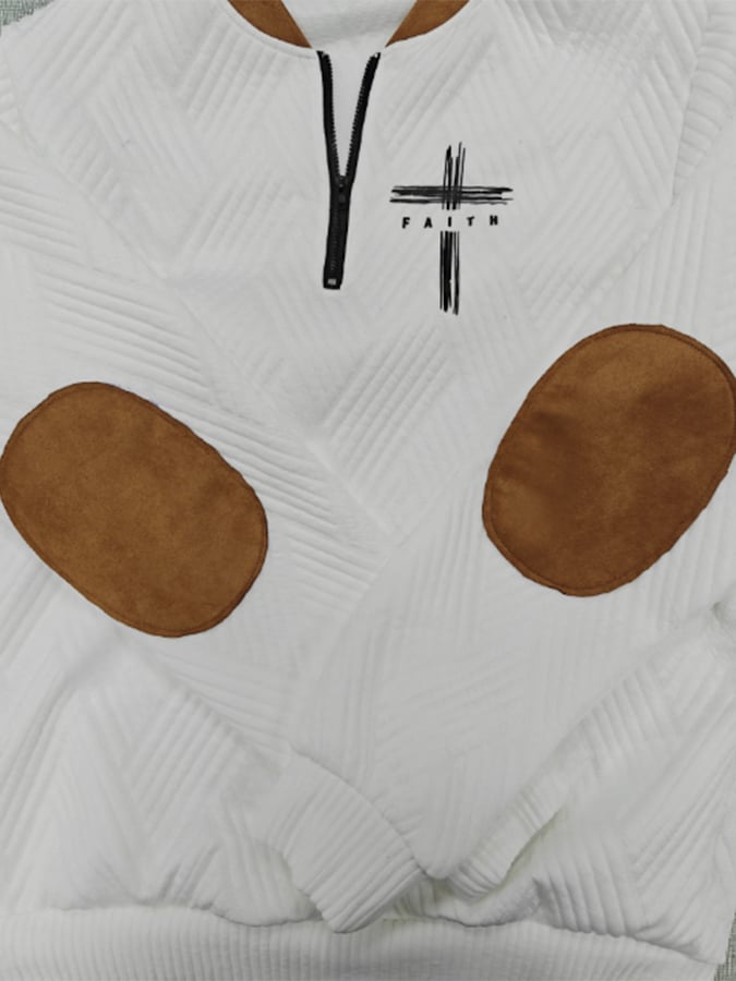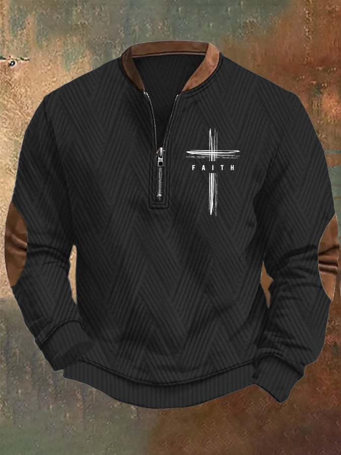 Men's retro Faith design jacquard fabric zip-up collar sweatshirt
