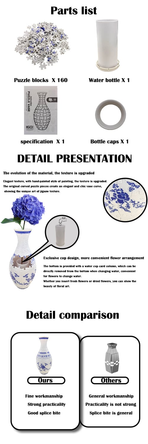 Unique Flower Vase - Made by 160-piece 3d curved puzzle pieces with a detachable water cup and stand. The finished size is 6.1 inches in diameter and 9.65 inches in height without a stand.