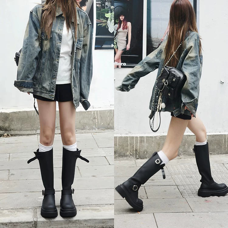 Women's Belt Buckle Over Knee Fall and Winter Round Toe Thick-soled Heightening Boots
