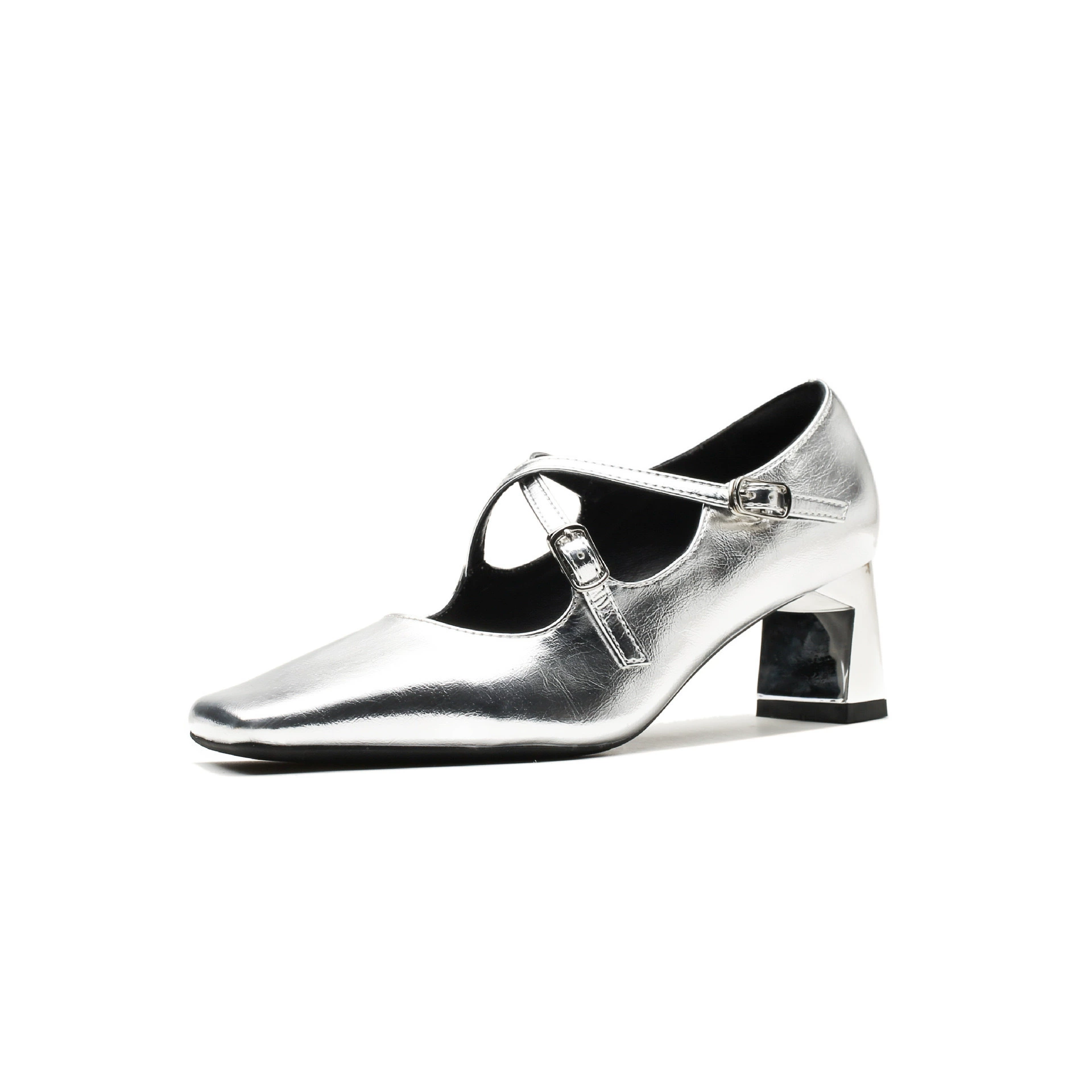 Women's Double Strap Silver Block Heel Square Toe Patent Leather Shoes